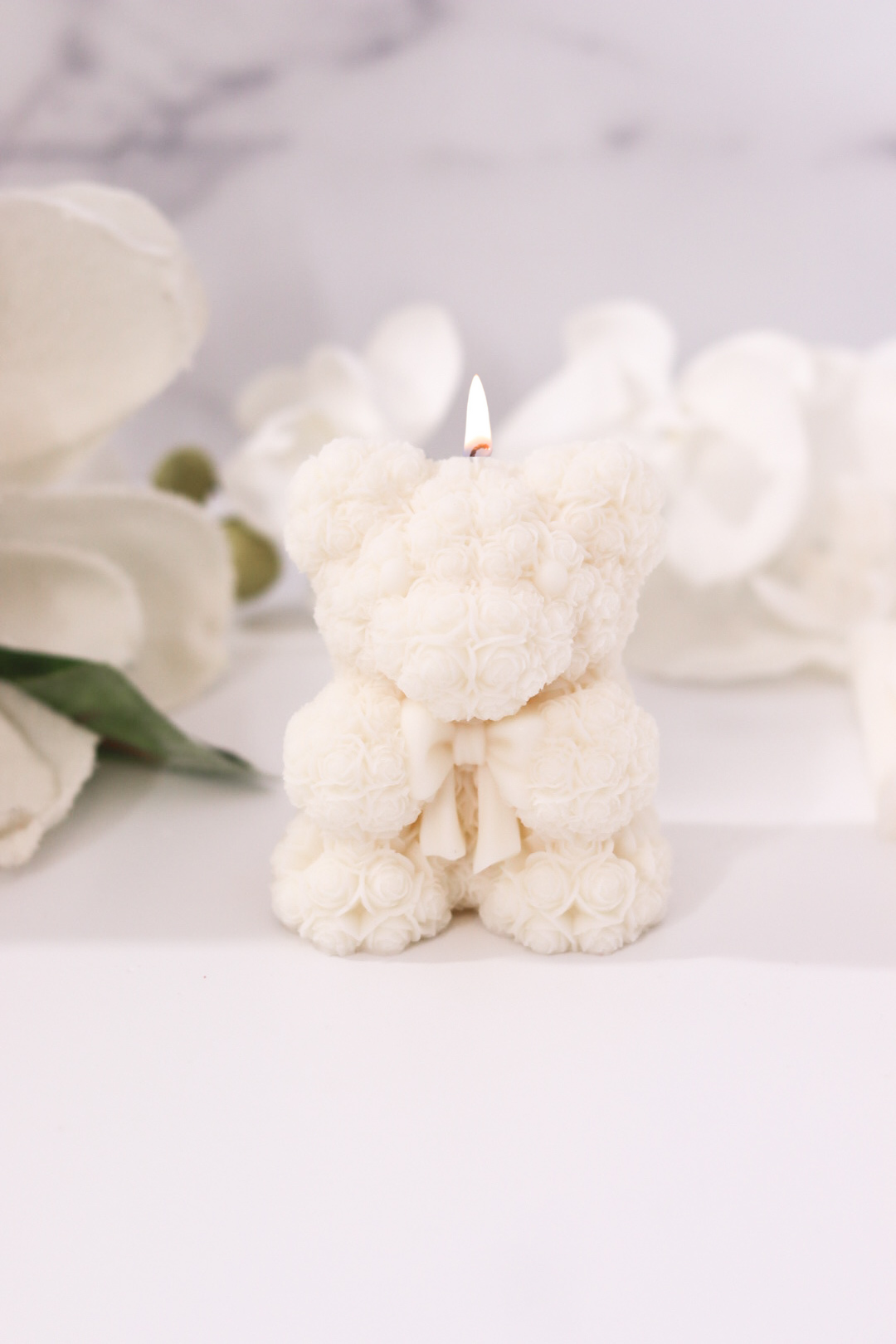 Our medium size Rose Bear Candle will be a delightful addition to your home decor. This bear-shaped candle displays tiny roses all over, giving your table an instant romantic and elegant touch. Place it on your coffee table or your sideboard and enjoy the subtle and romantic aroma that it brings.